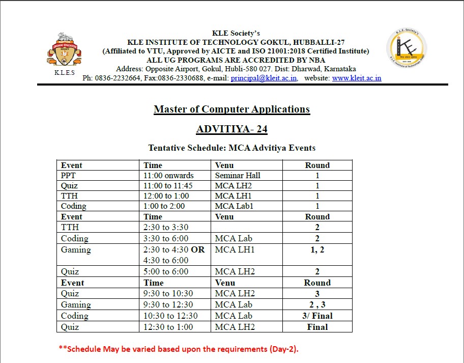 K.L.E. Institute of Technology proudly presents ADVITIYA-24, a two-day national-level technical event taking place in November 2024. ADVITIYA-24 stands as a testament to our journey toward excellence, with knowledge , experience, achievement, and triumph as its four pillars. This event promises an unparalleled experience, embodying both technical and non-technical events, creatively infused with energy and joy.